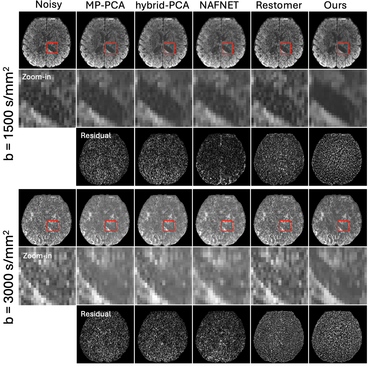 Developed a scanner-adaptive, coil-level denoising framework that conditions on measured noise statistics for robust performance across scanners and protocols. The method achieved up to a 23% reduction in residual noise compared to the next best-performing approach on in-vivo multi-coil diffusion MRI data.